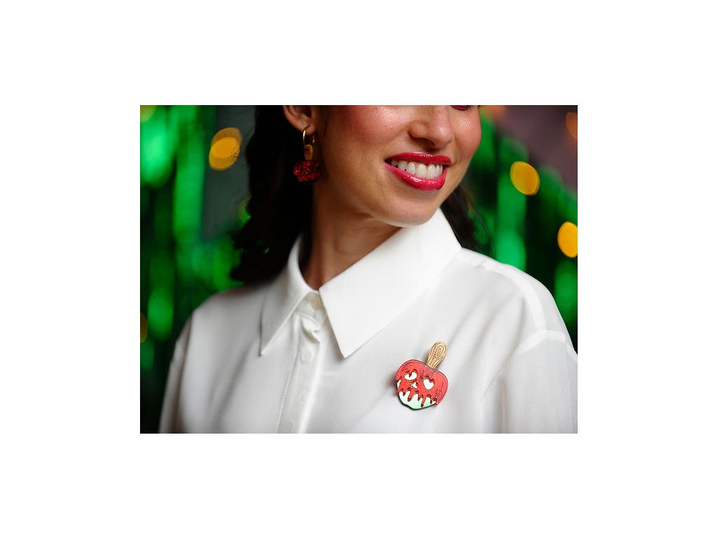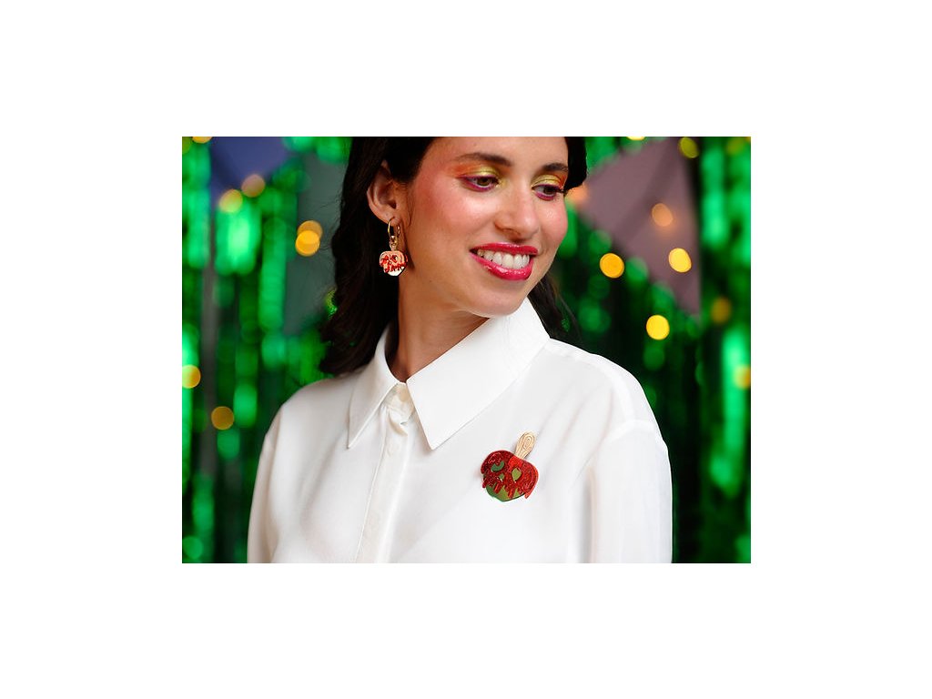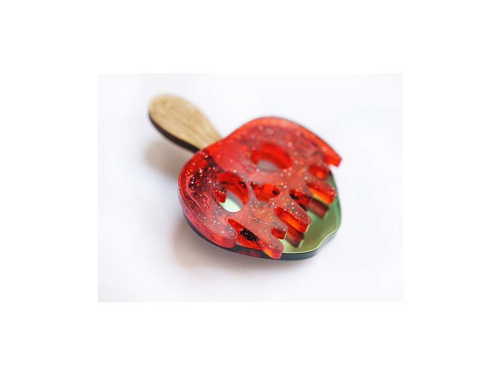 Klasické karamelové jablko v retro stylu poutí a cirkusů dostává nový šmrnc – díky třpytivému červenému a zelenému akrylu s efektem zrcadla působí sladce, ale i trochu záhadně.