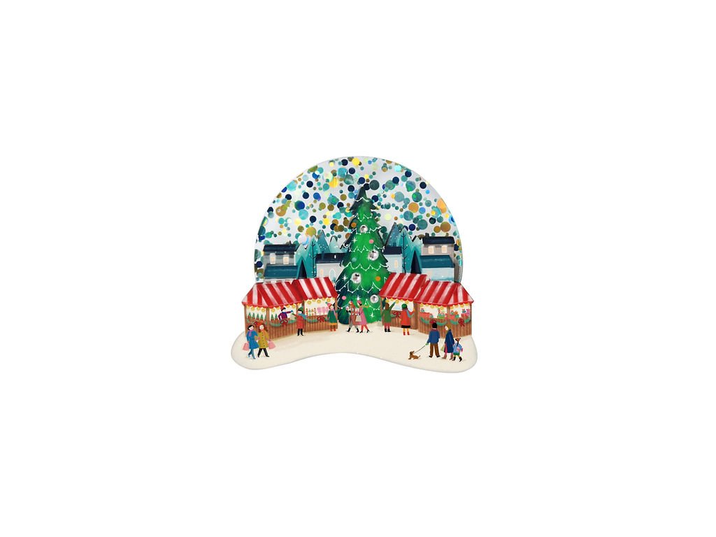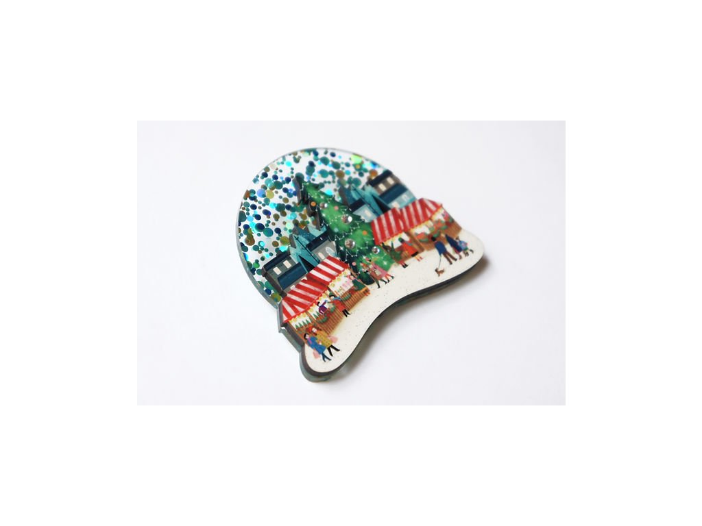 Uprostřed stánků se tyčí ozdobený vánoční strom, lidé se procházejí s horkým nápojem v ruce a vše doplňuje barevná zimní obloha – malý vánoční svět, který si můžete připnout na kabát.