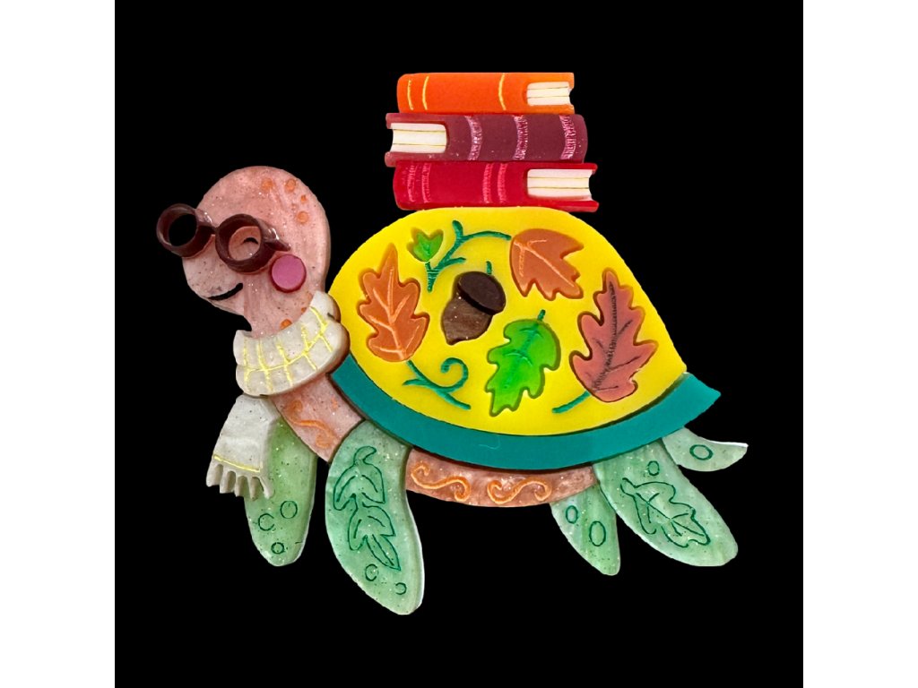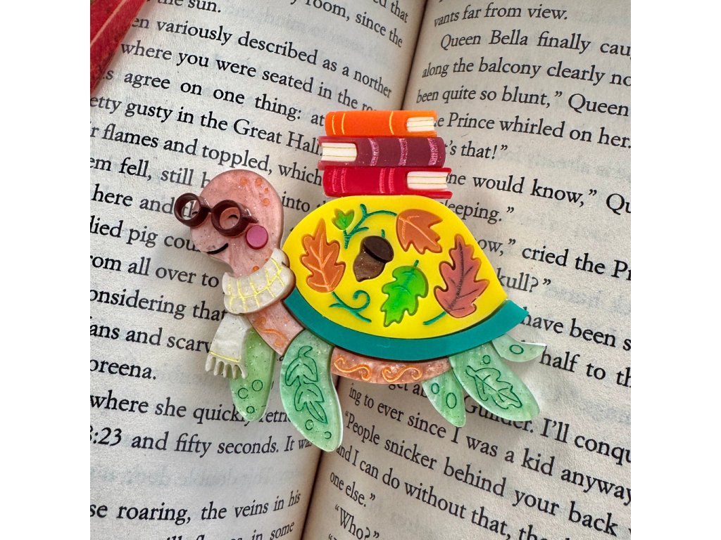 Brož Emily the Bookish Turtle od Wintersheart je poctou všem milovníkům čtení, teplých svetrů a klidných podzimních dní.