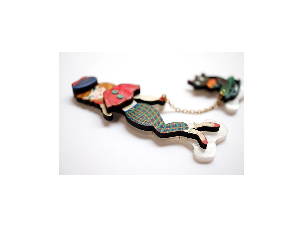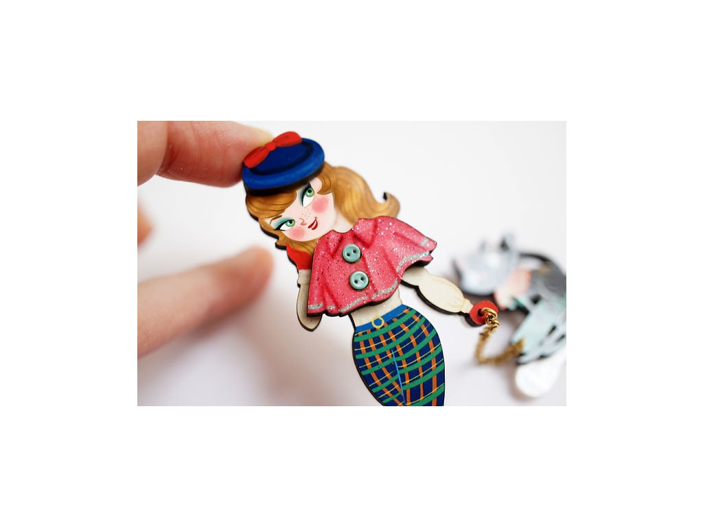 Každý detail je promyšlený – od miniaturních knoflíčků po zlatý řetízek spojující obě části brože. Ručně vyrobená kombinací dřeva a metakrylátu, působí jako malý výjev z ilustrované pohlednice 50. let.