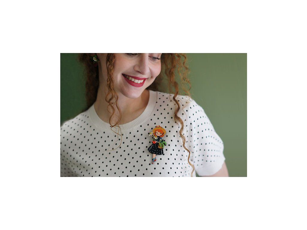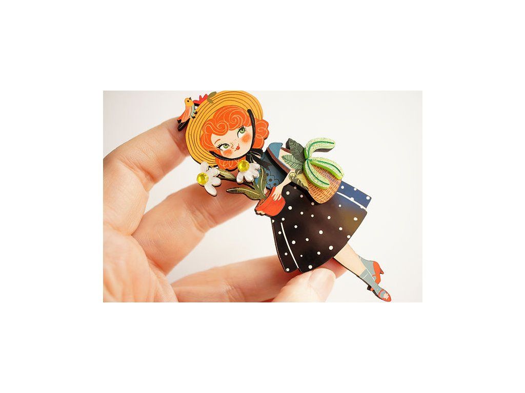 Brož Girl with Daisies od Laliblue je jako malý kousek jara, který můžete nosit každý den. Ilustrace dívky obklopené květinami a rostlinami působí něžně, hravě a plná života.