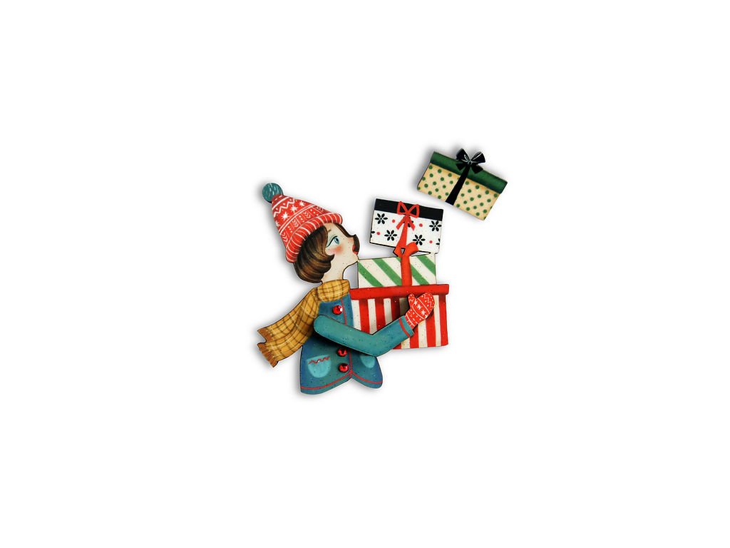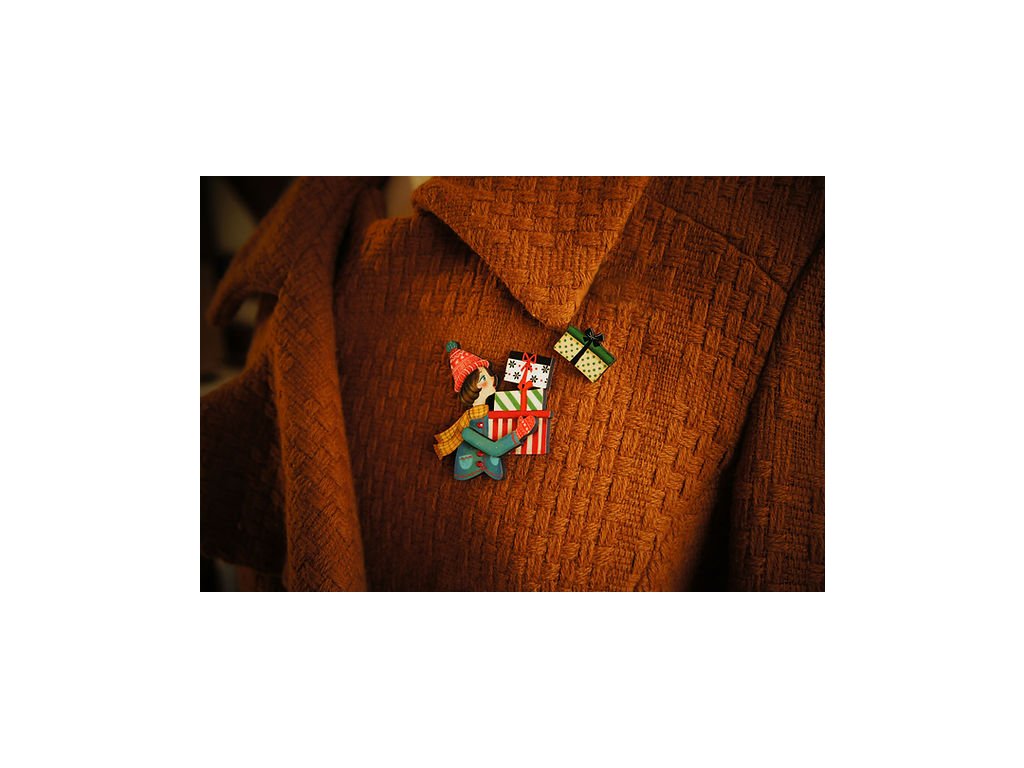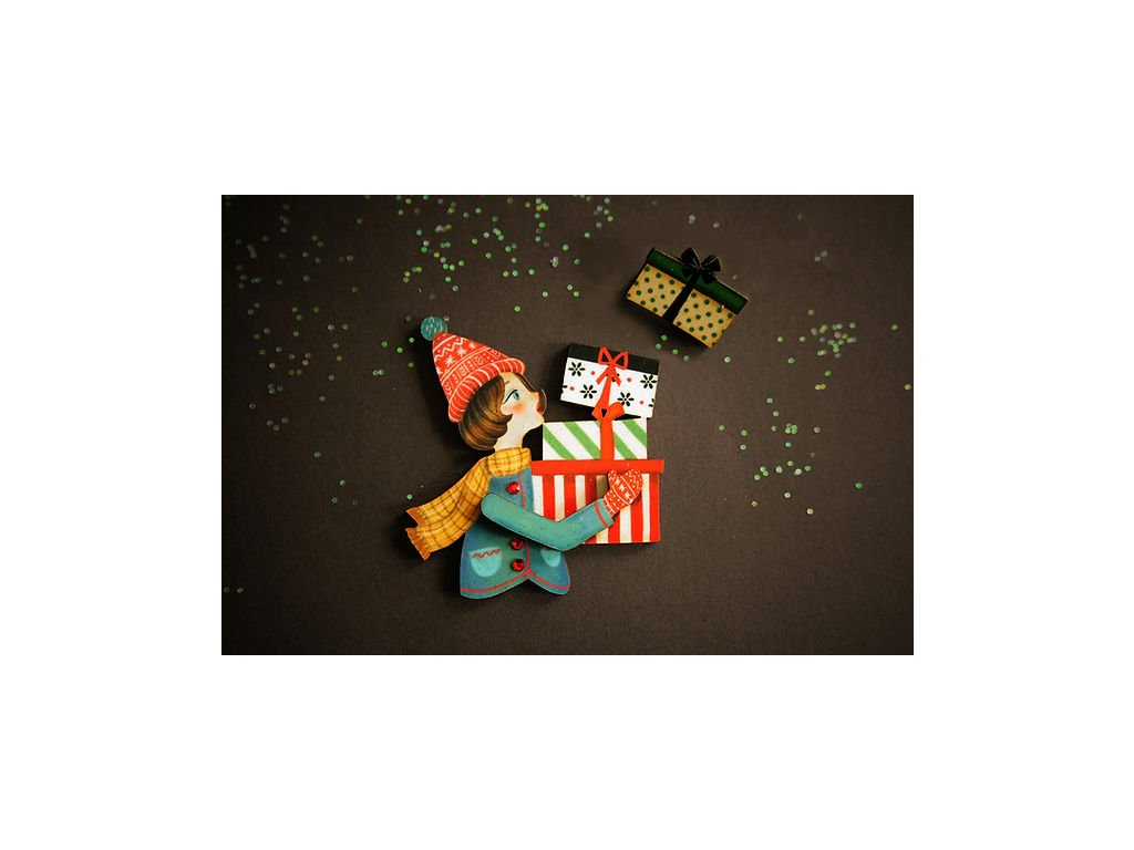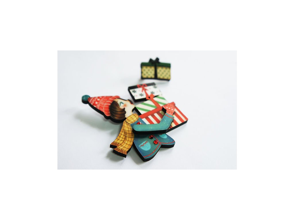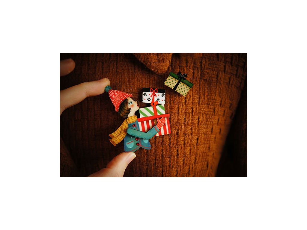 Brož Girl with Gifts od španělské značky Laliblue je jako vystřižená z vánoční pohlednice plné nostalgie a radosti. Ručně vyrobená z ilustrovaného dřeva, s jemnými červenými kamínky, zachycuje kouzelný okamžik svátečního shonu – dívku nesoucí hromadu krásně zabalených dárků. 🎁
