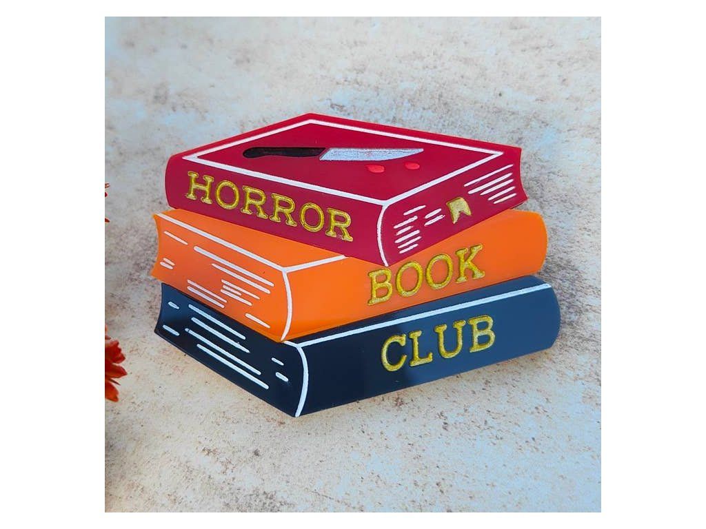 Brož Horror Book Club od Folk & Fortune je must-have pro všechny, kdo dávají přednost napětí, tajemnu a lehkému mrazení v zádech. Stoh knih v odvážných barvách s ikonickým „horror“ nádechem zaujme na první pohled – a malý detail nože na vrchní knize dodává ten správný dramatický twist.