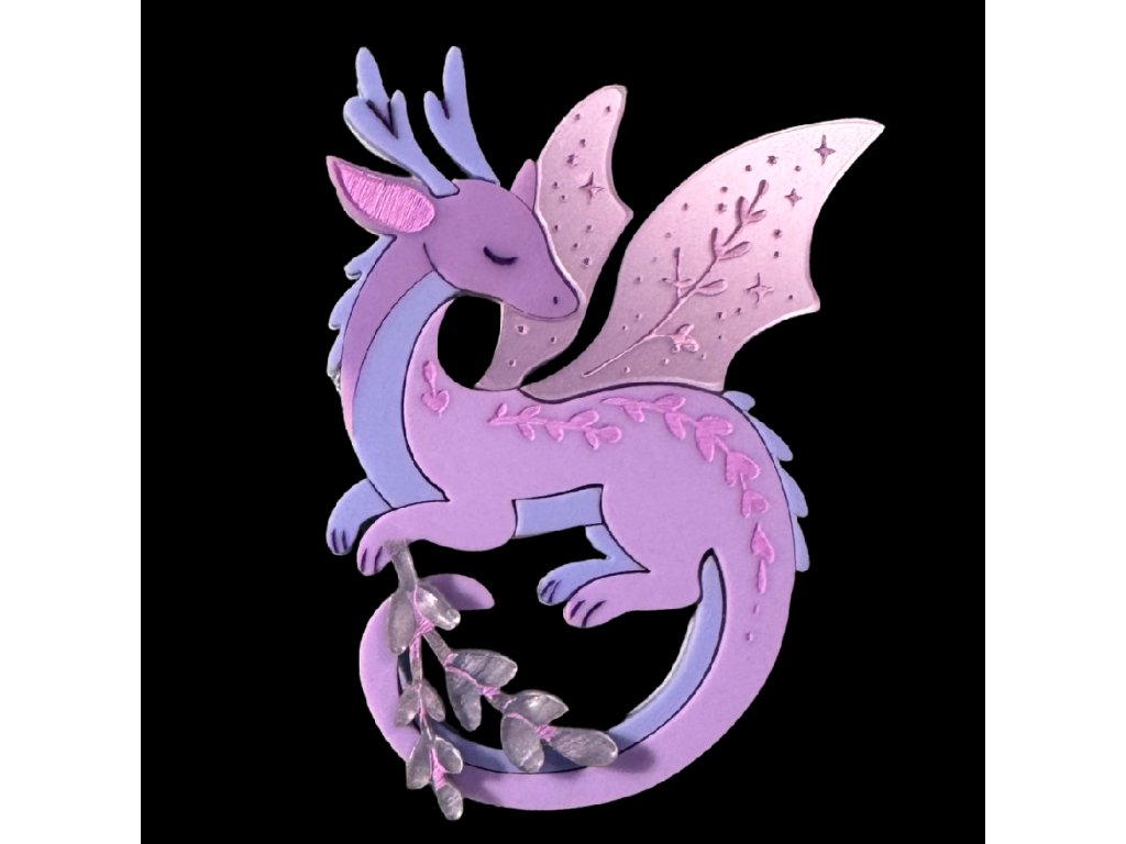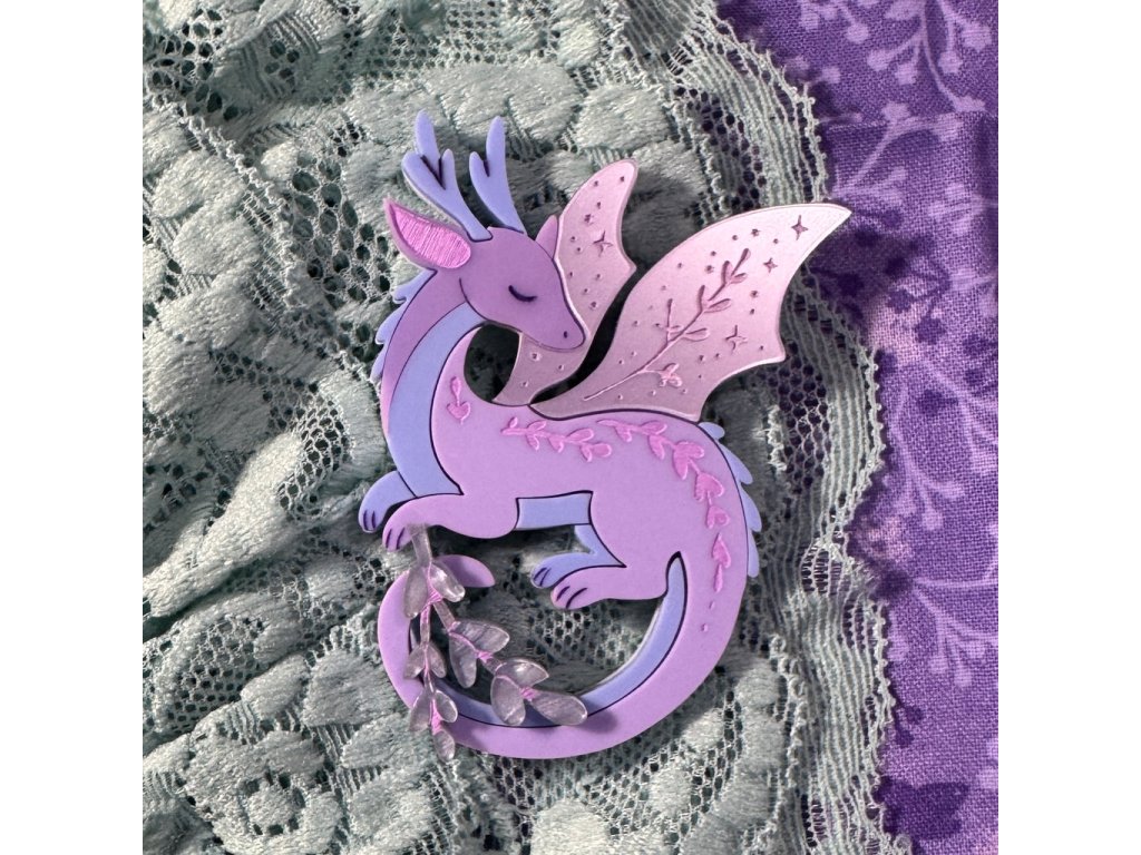 Typickým znakem této brože jsou propracované detaily – zdobená křídla, jemné rytí a ladná silueta draka se zavřenýma očima. Každý kus je ručně vyráběný, proto se může lehce lišit kresba a rozmístění vzoru na akrylu. Právě to dělá z každé brože originál.