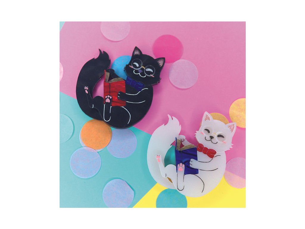 Perleťově bílá „Literary Kitty“ je tu, aby ti zpříjemnila den. Drží v tlapkách knihu, má na nose roztomilé brýle a její mašlička pod bradou jen potvrzuje, že jde o naprostou kočičí dámu. Skvěle se hodí k retro šatům i k modernímu outfitu a udělá radost každé milovnici čtení a koček.