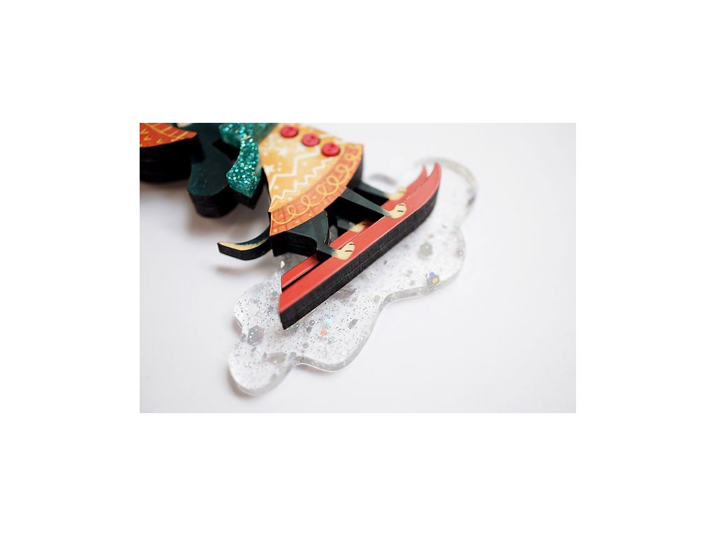 Brož je vyrobena z dřeva v kombinaci s metakrylátovými detaily, díky kterým krásně vyniknou barvy i textury. Malované knoflíčky, třpytivý šátek a efekt sněhového podkladu jsou typickými prvky poctivé ruční práce LaliBlue.