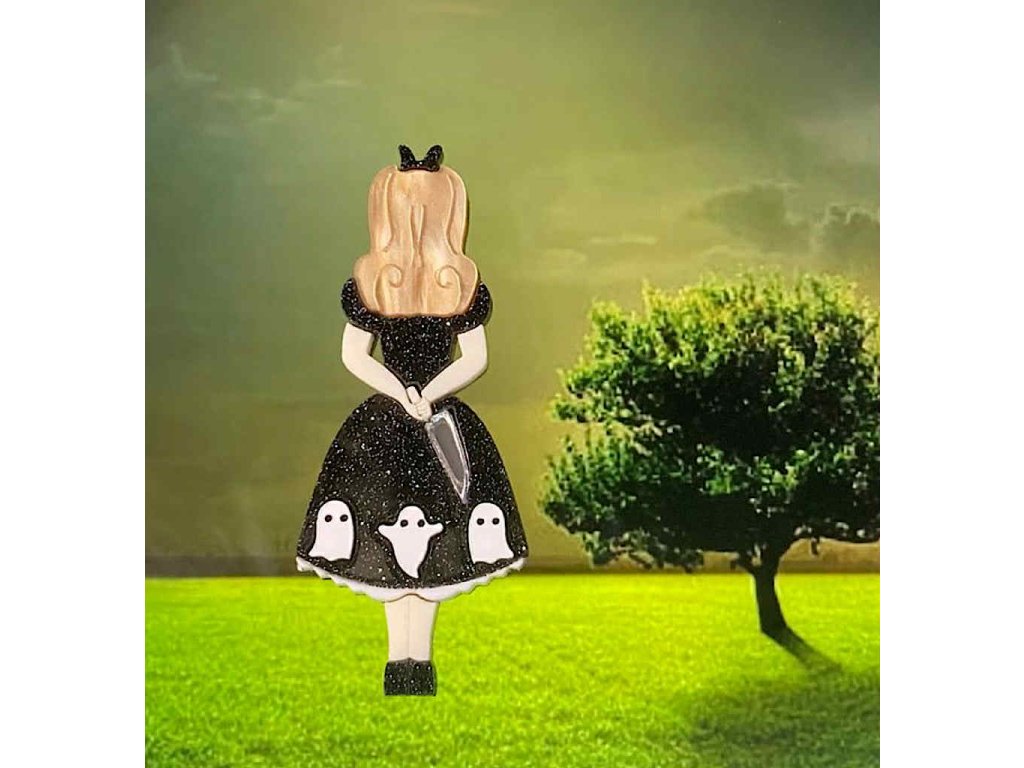 Tato jedinečná brož od značky Tantalising Treasures zachycuje tajemnou Alenku v černých třpytivých šatech, ozdobených motivy duchů. Její záhadná elegance a nádech temné romantiky dělají z této brože ideální kousek pro Halloween i pro ty, kteří milují retro šperky s nápadem.