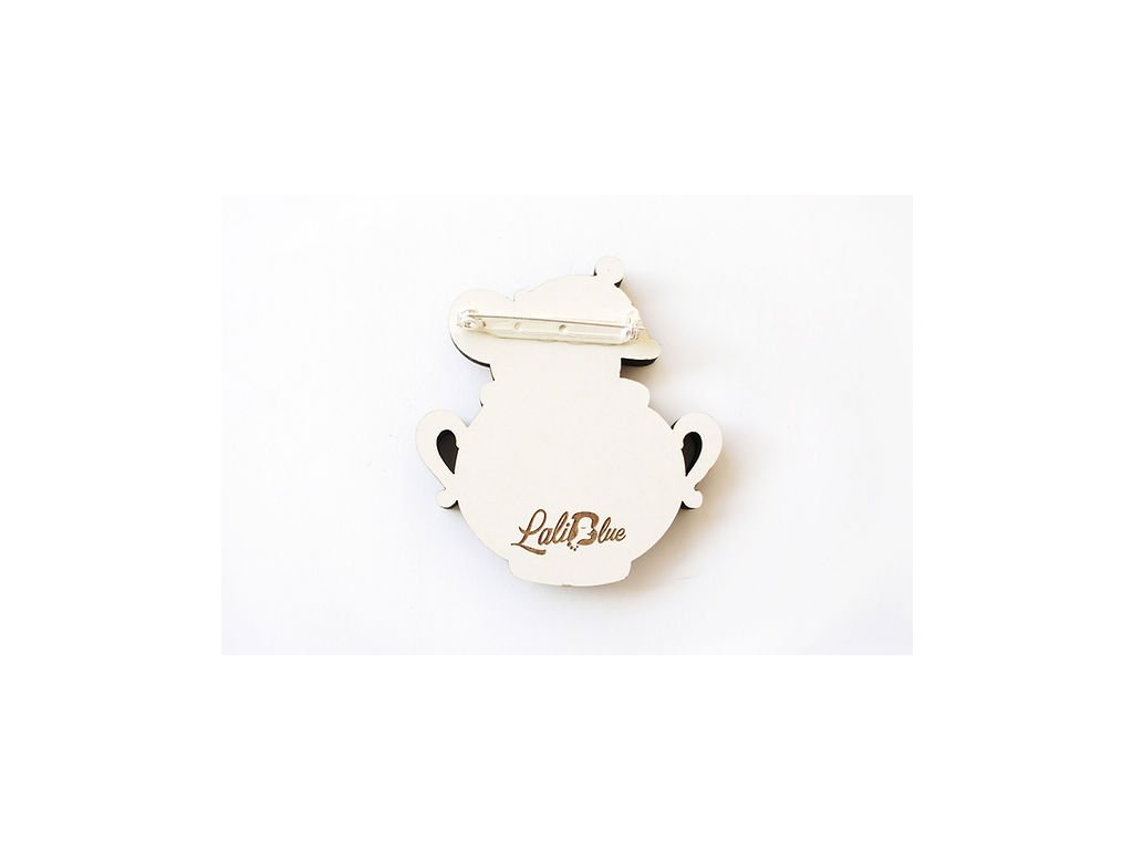 Brož je vyrobena z ilustrativního dřeva s lesklým povrchem, díky kterému vyniknou barvy i ručně malované detaily na ouškách, květině a víčku. Díky bezpečnostnímu zapínání ji snadno připneš na svetr, šaty, kabátek nebo kabelku.