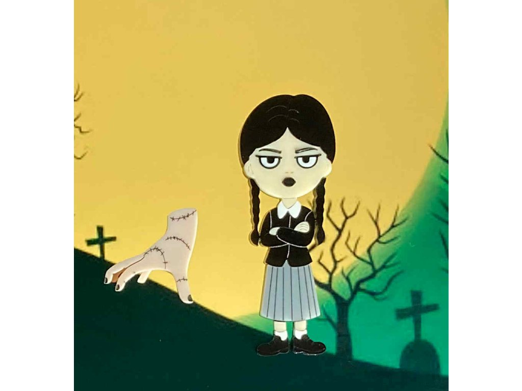 Stylová kombinace dvou broží přináší nádech temného humoru a gotické elegance, kterou ocení každý milovník Halloweenu i retro doplňků s příběhem.