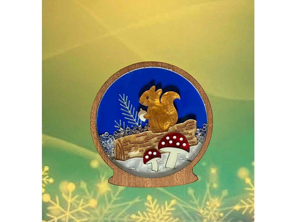 Brož Yuletide Cheer Shaker připomíná malý zimní svět zavřený do kulaté siluety. Veverka sedící na polínku, sněhová krajina a drobné třpytivé „sněhové“ kamínky, které se při pohybu brože lehce přesýpají, vytvářejí nenápadně živý efekt.