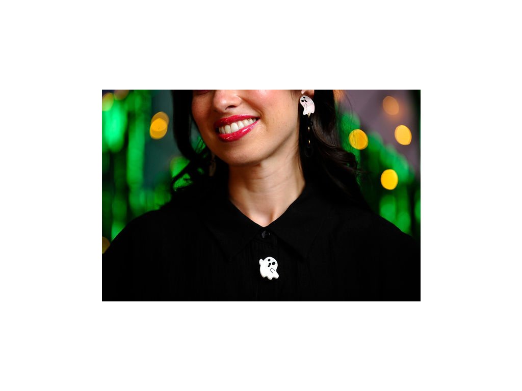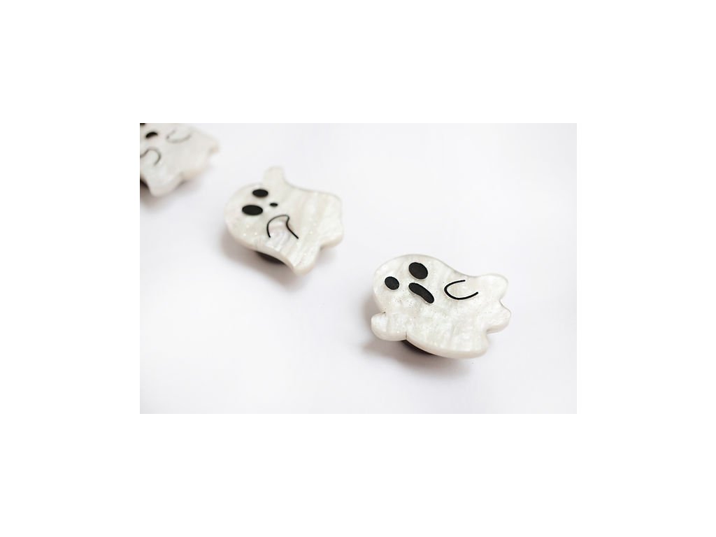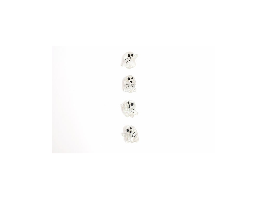 Tato sada čtyř duchů je vyrobena z perleťově bílého akrylu a dodává se se zapínáním na cvok.