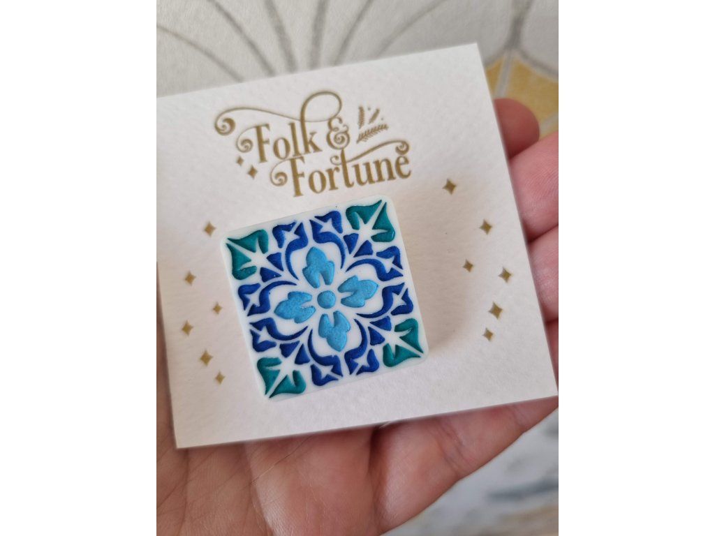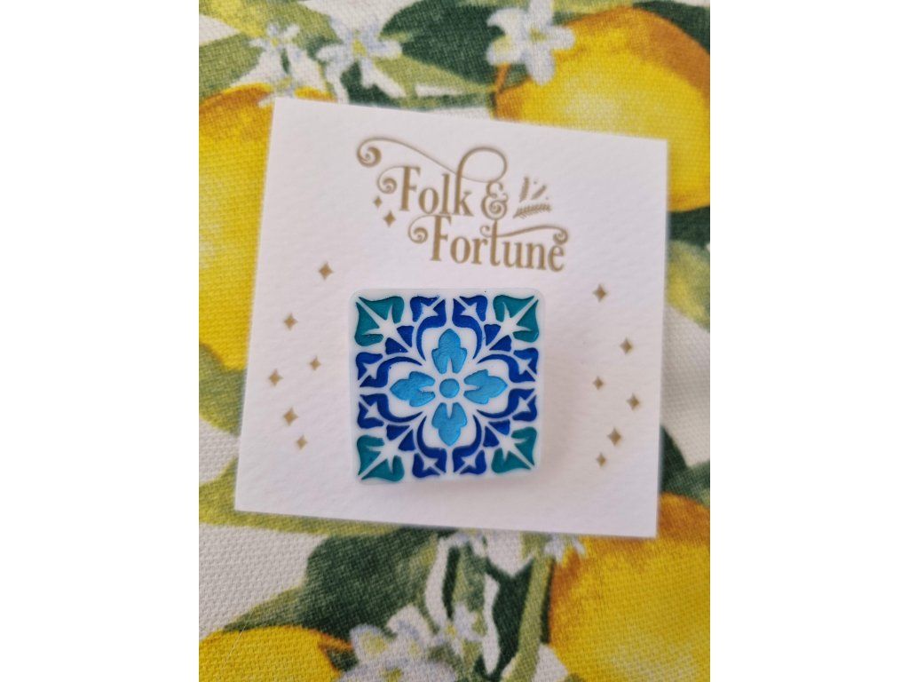 Mini brož Mediterranean Tile 1 od značky Folk and Fortune přináší kousek středomořské atmosféry do každodenního outfitu. Jemný ornament v odstínech modré a tyrkysové připomíná tradiční keramické dlaždice z jihu Evropy.