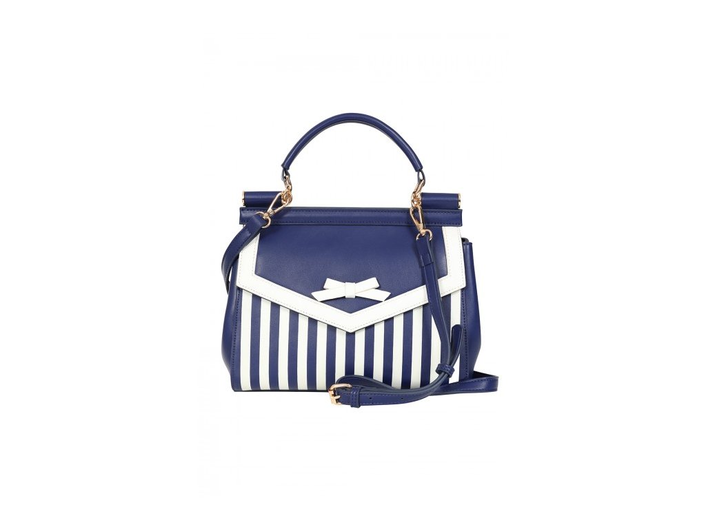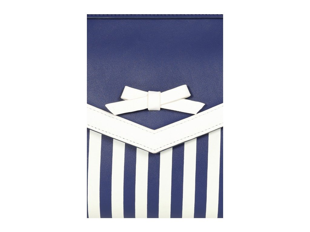 Tato kabelka je jako pohlednice z dovolené na jachtě! Modro-bílé pruhy, jemná mašlička a retro střih dodávají kabelce Ravello nezaměnitelný šarm 50. let. Vyrobena z veganské kůže, se zlatými detaily a praktickým vnitřním uspořádáním. Součástí je i odepínací popruh přes rameno.