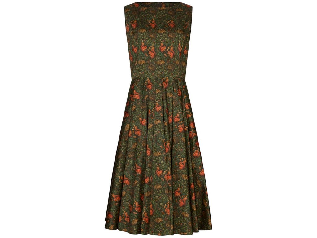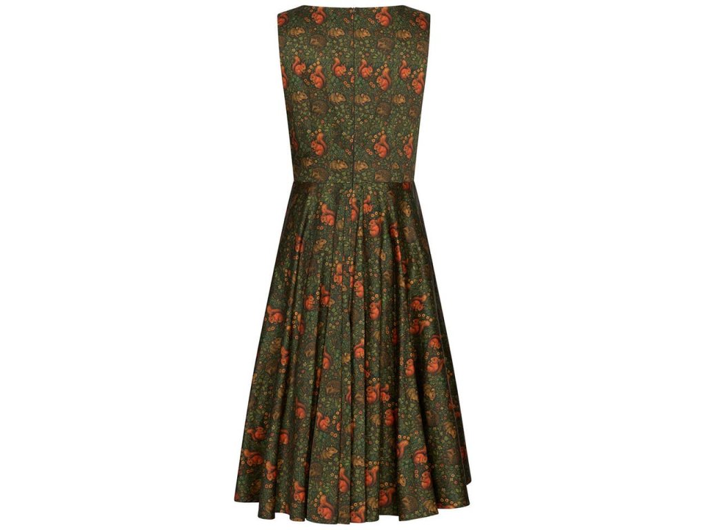 Šaty Audrey Squirrel Friends od Succubus Clothing jsou skutečným pokladem pro milovnice retro stylu a lesní romantiky. Limitovaná edice okouzlí detailním potiskem veverek, myšek a ježků mezi listím a květy, který působí jako z pohádkové knihy.