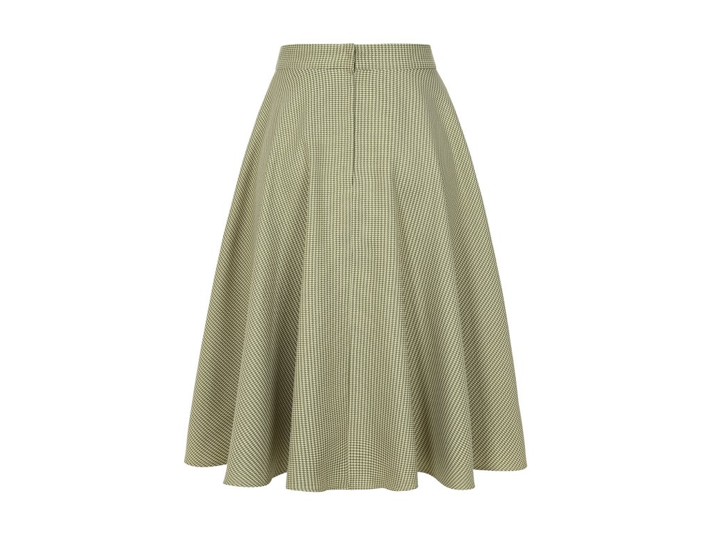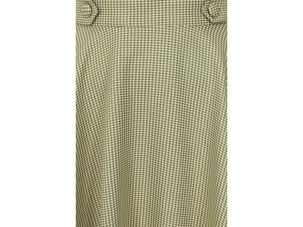 Elegantní retro silueta, která nikdy nezklame. Sukně DiDi v olivovo-bílé barevné kombinaci s jemným kohoutím vzorem (houndstooth) je ideálním kouskem pro milovnice ženského a nadčasového stylu. Kolový střih krásně zvýrazní pas a vytváří ladný pohyb při každém kroku.