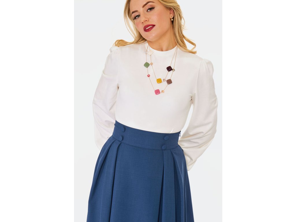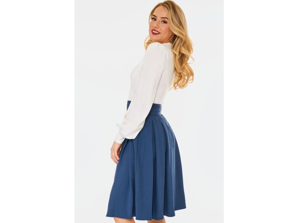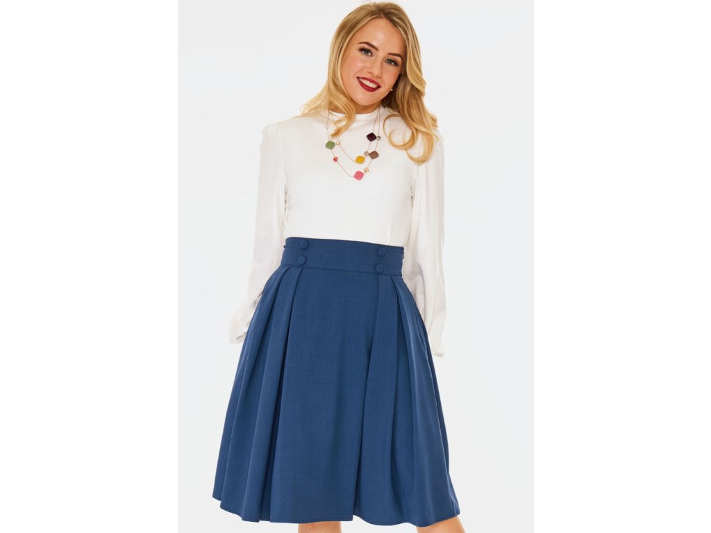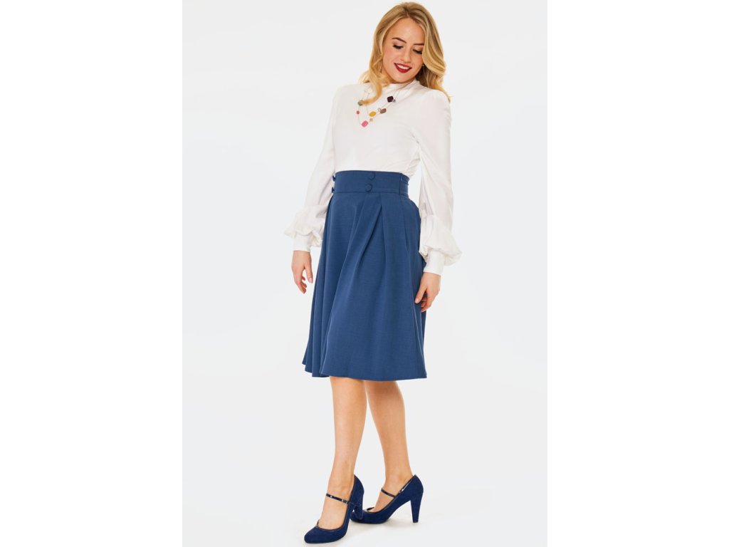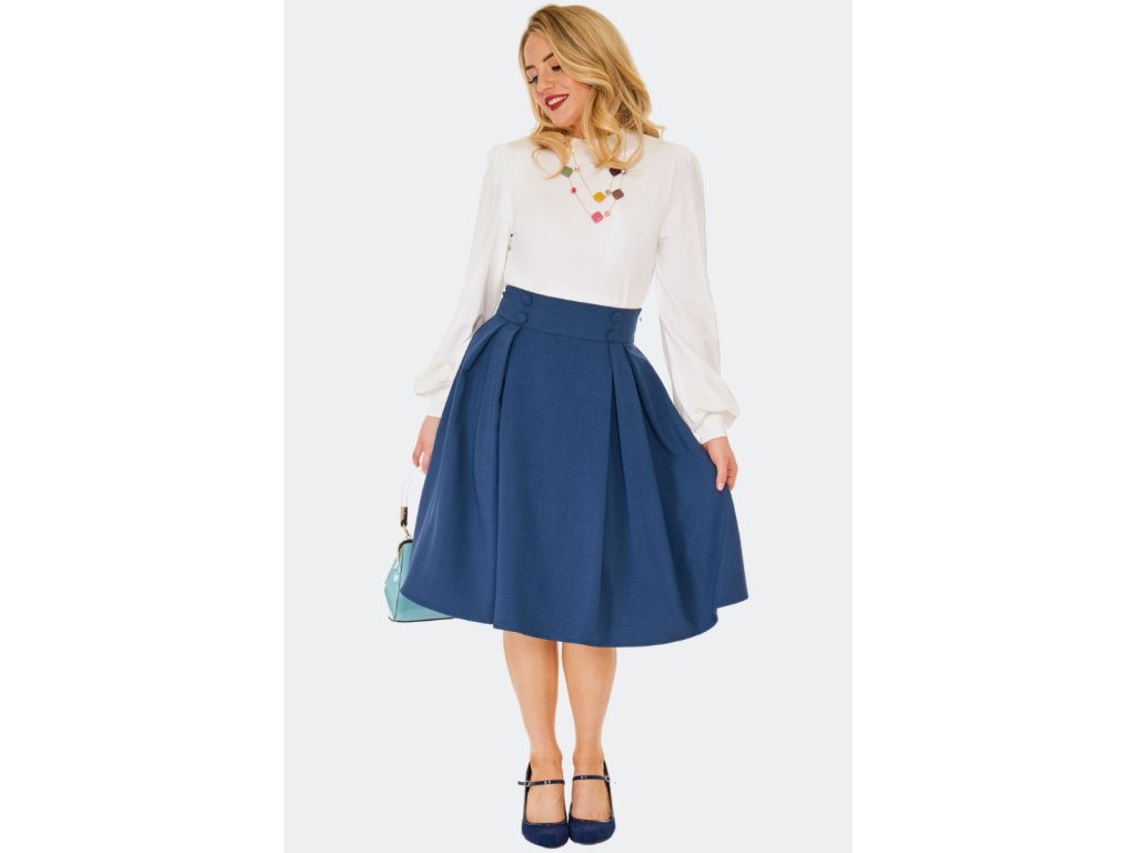 Kombinace klasické modré barvy a lichotivého áčkového střihu dělá z této sukně univerzální kousek, který snadno zkombinujete s halenkou, svetříkem či topem. Perfektní volba jak pro každodenní nošení, tak i pro speciální příležitosti.
