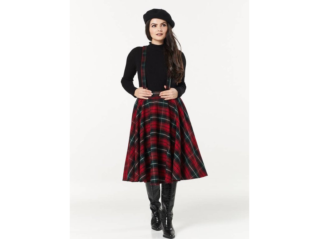 Retro klasika inspirovaná 50. lety, která by neměla chybět v žádném šatníku. Sukně Sophie v tradičním červeno-zeleném tartanovém vzoru je ušitá z luxusní vlněné tkaniny a zaujme vysokým pasem, kolovým střihem a elegantní délkou těsně pod kolena.