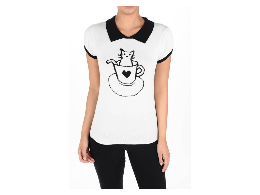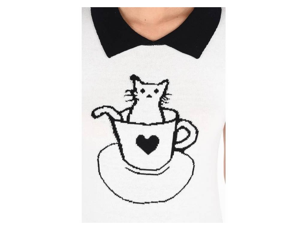 V ivory barvě s výrazným kontrastním černým límcem a rukávy, doplněný roztomilým potiskem čajového šálku — ideální spojení elegance, hravosti a pohodlí.