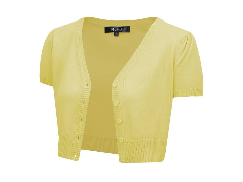 Svetřík Mak Baby Yellow s krátkým rukávem je krásný doplněk pro retro i vintage outfit. Kratší střih do pasu skvěle ladí s kolovými sukněmi i šaty ve stylu 50. let a zvýrazní ženskou siluetu. Výstřih do V a zapínání na knoflíky dodávají svetříku klasický a elegantní vzhled.