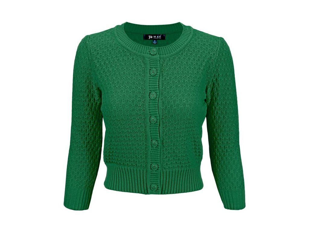 Tento krátký cardigan je inspirován ikonickou pin-up módou 50. let a přináší do vašeho šatníku nádech nostalgie. Díky unikátnímu vzoru a krátkému střihu zvýrazní pas a krásně doplní šaty i sukně s vysokým pasem.