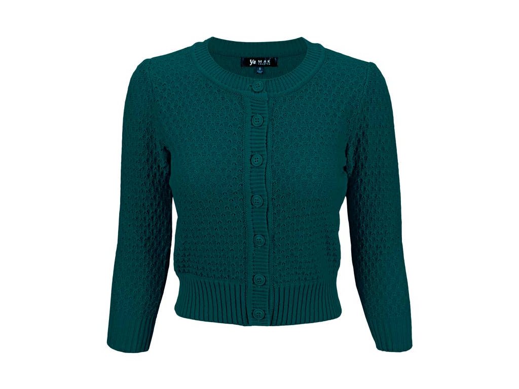 Tento krátký cardigan je inspirován ikonickou pin-up módou 50. let a přináší do vašeho šatníku nádech nostalgie. Díky unikátnímu vzoru a krátkému střihu zvýrazní pas a krásně doplní šaty i sukně s vysokým pasem.