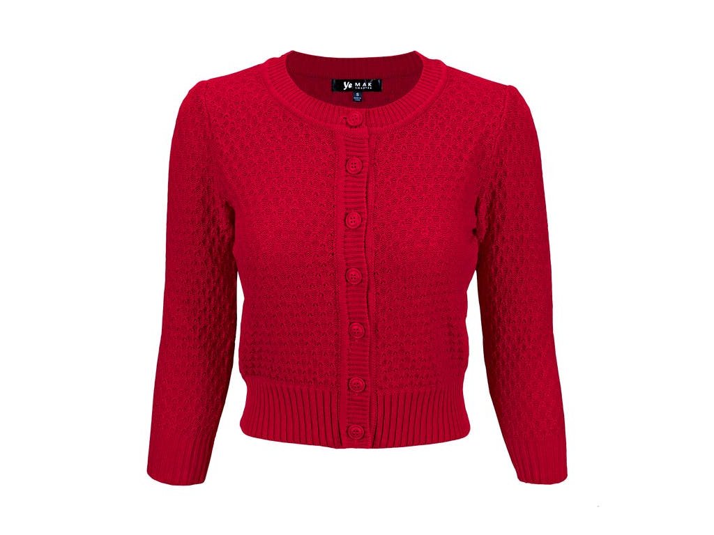 Tento krátký cardigan je inspirován ikonickou pin-up módou 50. let a přináší do vašeho šatníku nádech nostalgie. Díky unikátnímu vzoru a krátkému střihu zvýrazní pas a krásně doplní šaty i sukně s vysokým pasem.