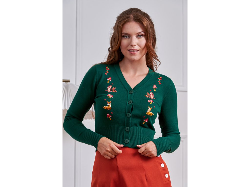 Klasický V výstřih, zapínání na knoflíky a dlouhé rukávy krásně zvýrazní siluetu a umožní snadné kombinování s vintage sukněmi, kalhotami i moderními outfity. Zelený odstín působí přirozeně, hřejivě a perfektně doplňuje podzimní i celoroční šatník.