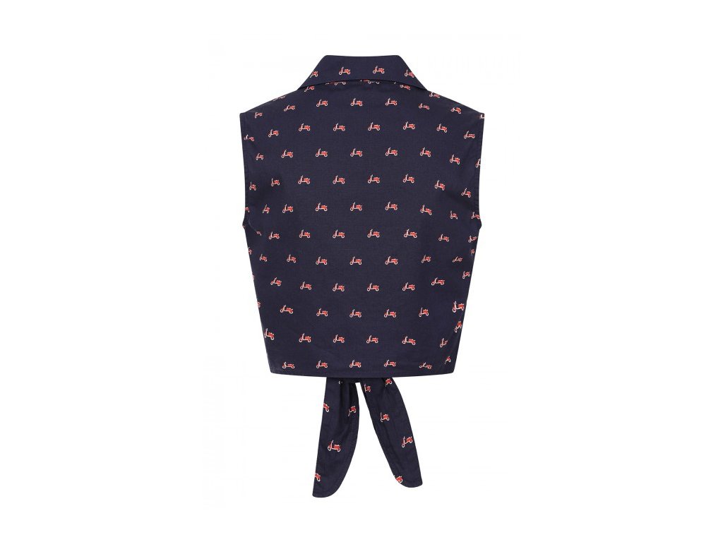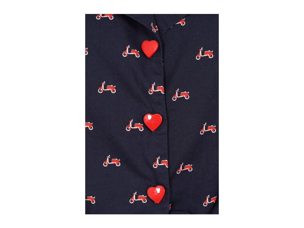 Hledáš top, který kombinuje styl 50. let s hravými detaily? Tato halenka si tě získá na plné čáře! Roztomilý vzor s červenými vespami, ikonické srdíčkové knoflíčky a zavazování v pase z ní dělají dokonalý kousek pro letní retro outfity.
