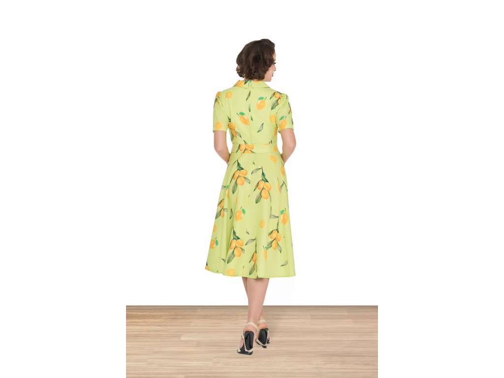 Rozjasněte svůj den i šatník šaty Daisy Lemon! Tento svěží model v limetkově zelené barvě s veselým citronovým potiskem je jako stvořený pro milovnice retro módy a letní atmosféry. Klasický střih inspirovaný 50. lety krásně zvýrazní pas díky přiloženému pásku, výstřih s límečkem dodá šmrnc a kolová sukně nabídne prostor pro tanec i volnost pohybu.