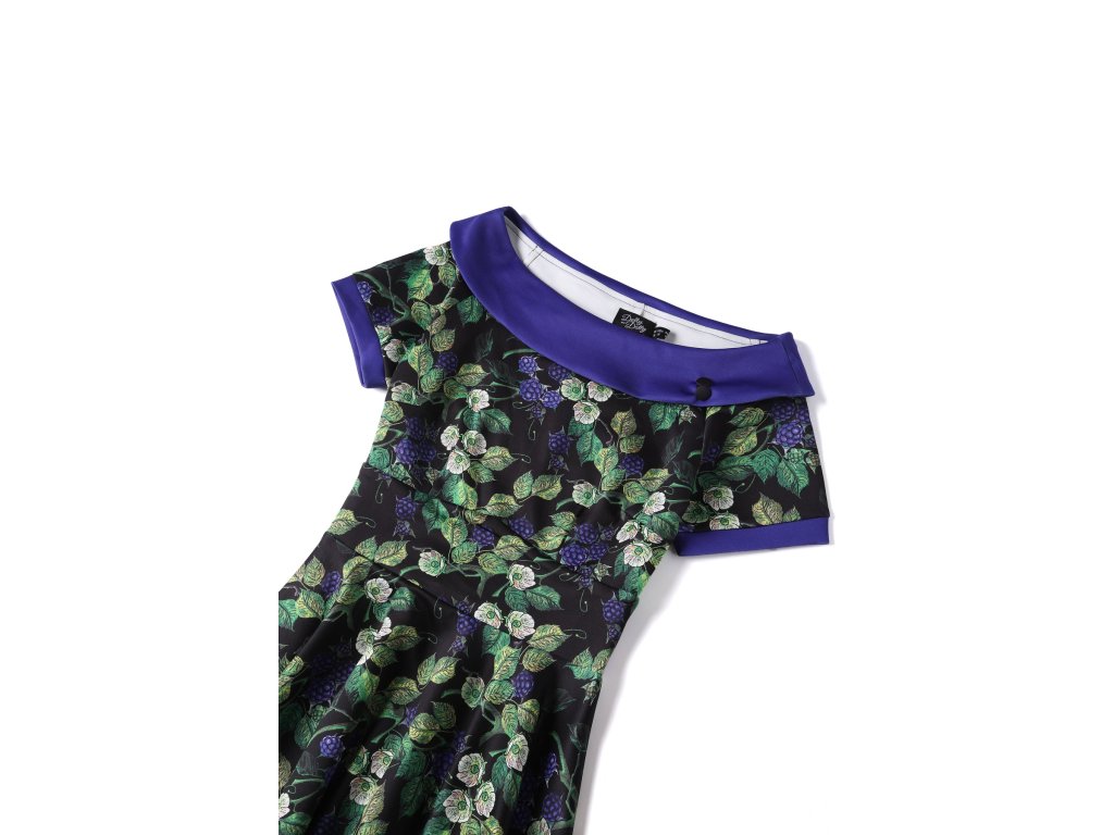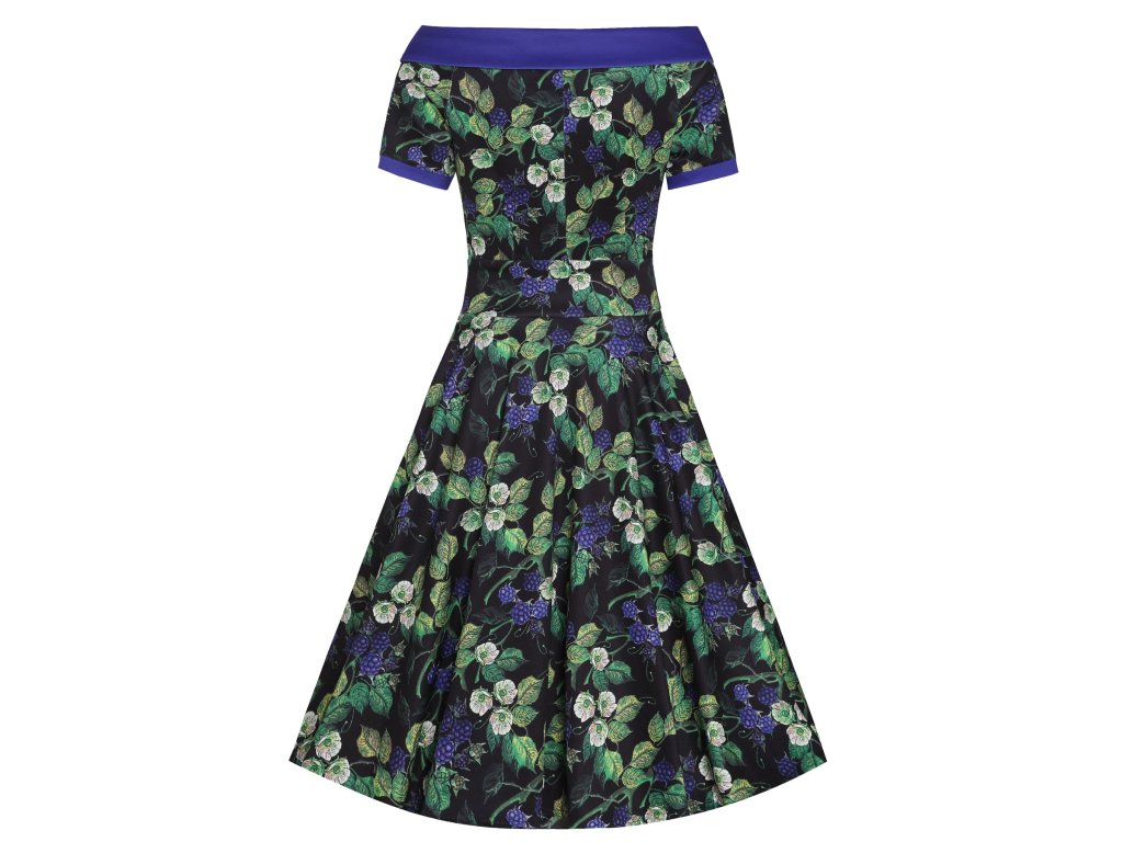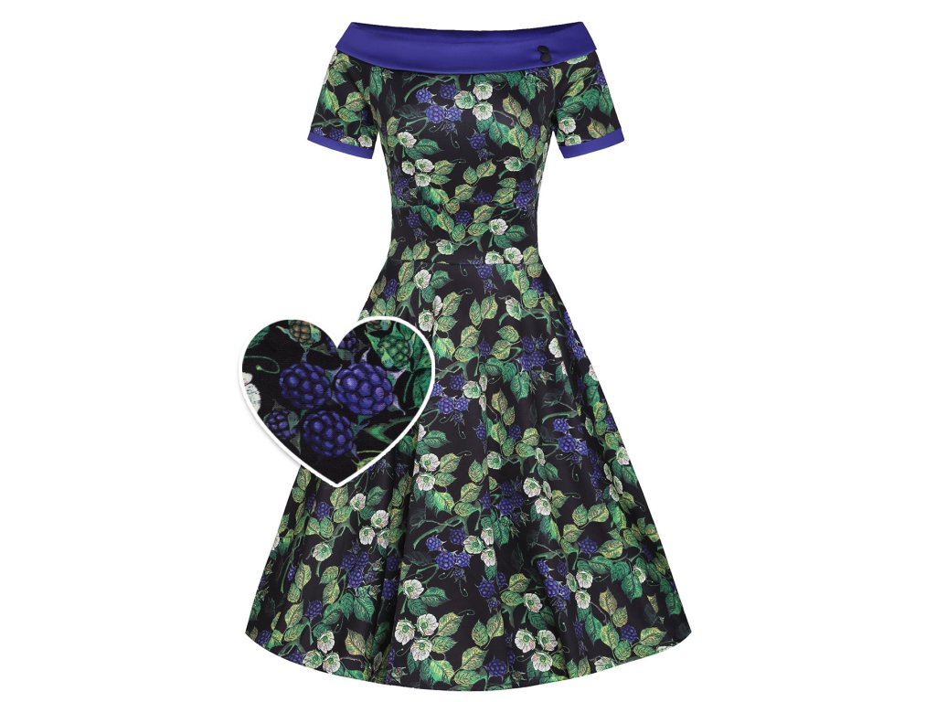 Když se elegance 50. let spojí s temnou romantikou lesních plodů, vzniknou šaty, které okouzlí na první pohled. Svůdný střih s odhalenými rameny, knoflíkovým detailem a přiléhavým pasem vytváří nádhernou ženskou siluetu, zatímco kolová sukně zve k tanci i k obdivu.