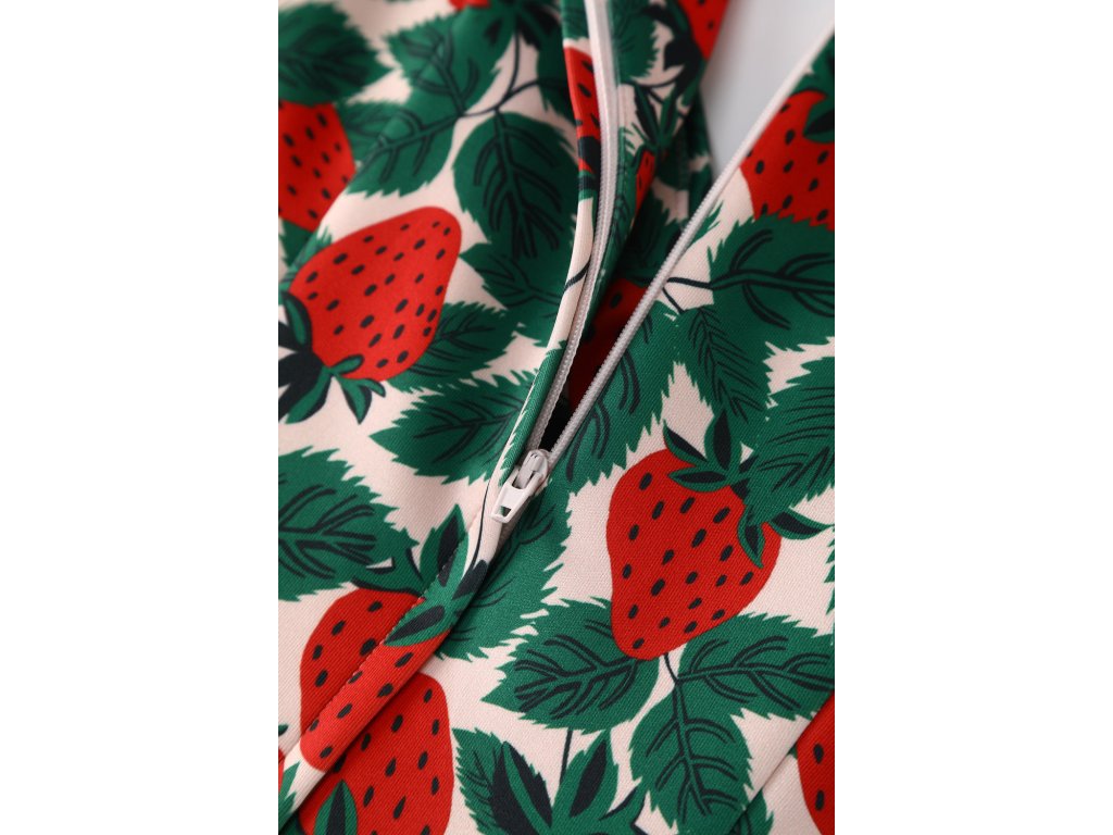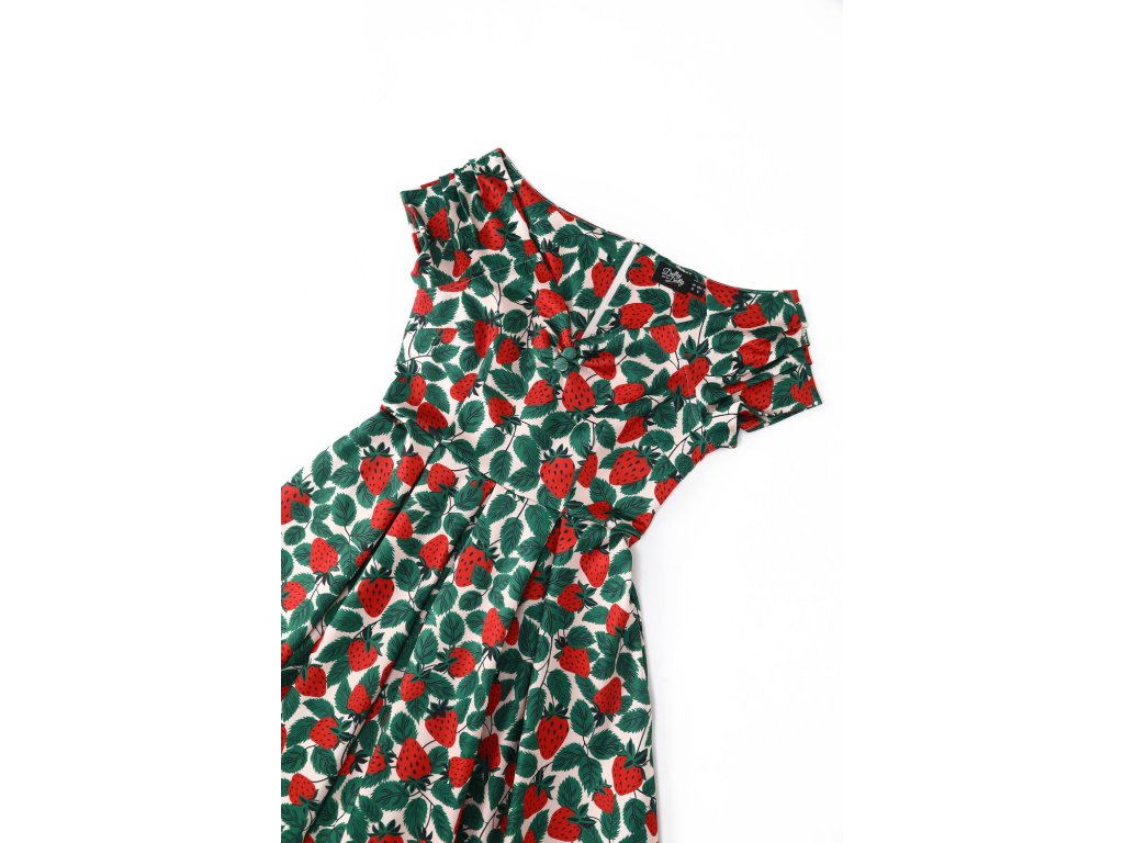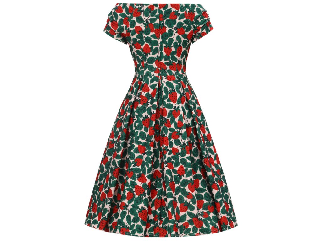 Šaty Lily White Off Shoulder Strawberry Farm přináší do vašeho šatníku kouzlo slunných jahodových polí. Romantický off-shoulder výstřih s jemně nařaseným živůtkem a dekorativními knoflíčky podtrhne ženskou siluetu, zatímco vysoký pas a rozevlátá skládaná sukně v ikonickém 50’s stylu vám zajistí elegantní retro vzhled. Potisk s červenými jahodami na světlém podkladu navodí tu pravou letní atmosféru, ať už vyrazíte na piknik, procházku po promenádě nebo letní slavnost. Praktické skryté kapsy a pohodlný materiál s jemnou pružností zajišťují maximální komfort po celý den. Skrytý zip vzadu pro snadné oblékání.