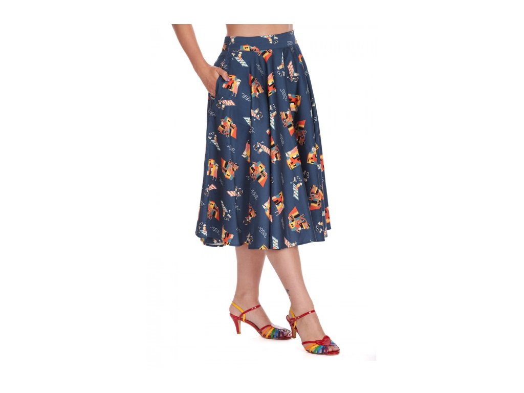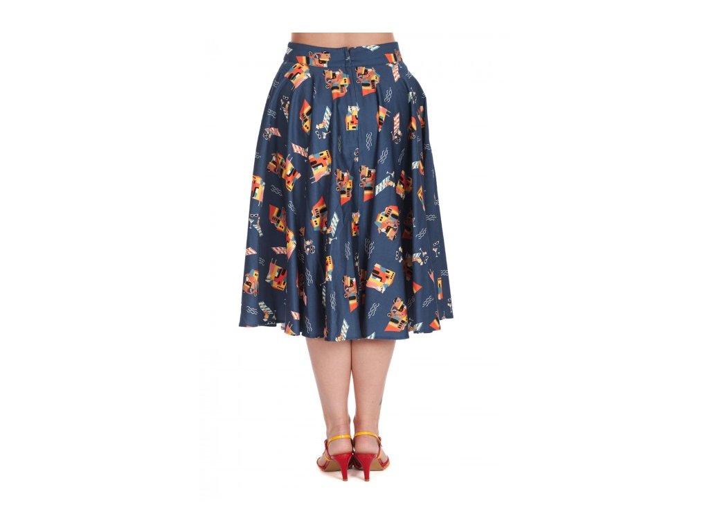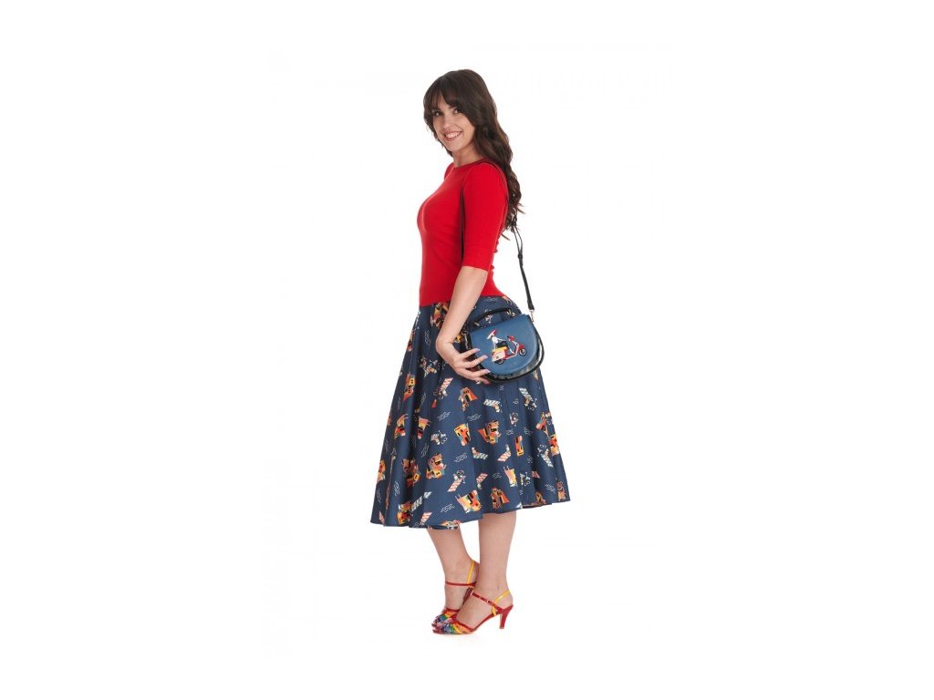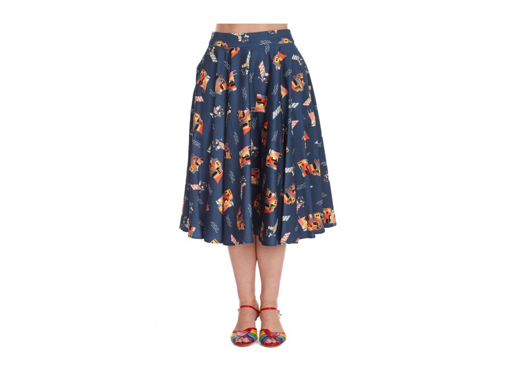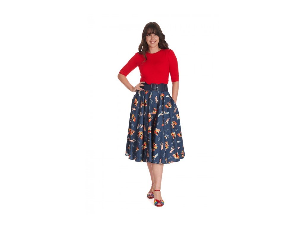 Sukně, která vás přenese přímo na písečnou pláž! Tento retro kousek s potiskem plážových kabinek, dámských siluet na lehátkách, koktejlů a ikonického skútru je oslavou letní bezstarostnosti. Námořnická modrá vytváří elegantní kontrast s veselými barvami potisku. Vypasovaný pas, pohodlné kapsy a klasický střih do A zajistí nejen styl, ale i pohodlí. Ideální pro milovnice pin-up módy, které chtějí být vidět!