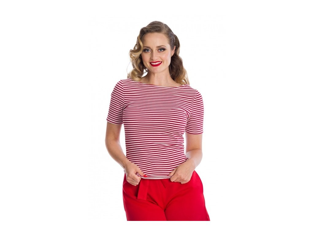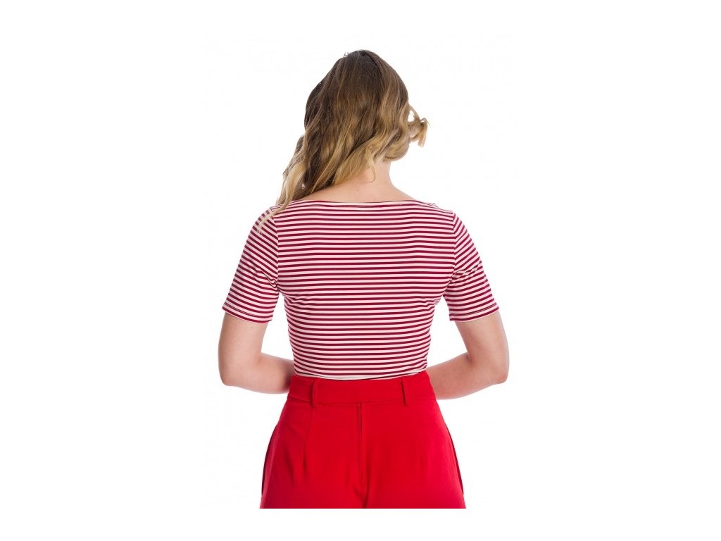 Jednoduchý, ale naprosto nepostradatelný. Top Szizzle v červeno-bílém pruhovaném provedení je skvělým základem každého retro šatníku. Díky lodičkovému výstřihu ve stylu 60. let a příjemnému bavlněnému materiálu se hodí jak ke swingové sukni, tak ke kalhotám s vysokým pasem či džínům.