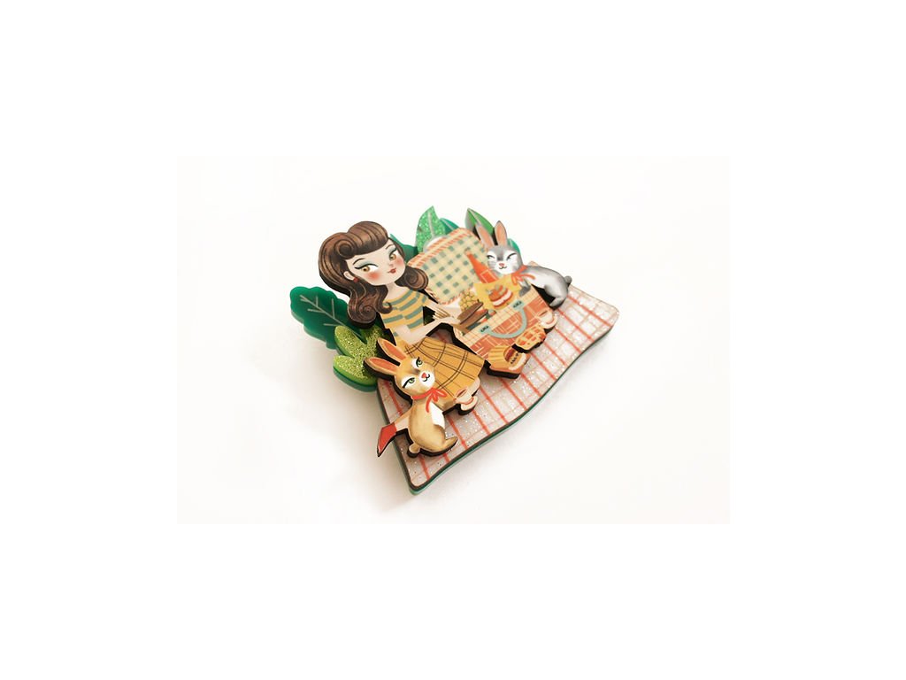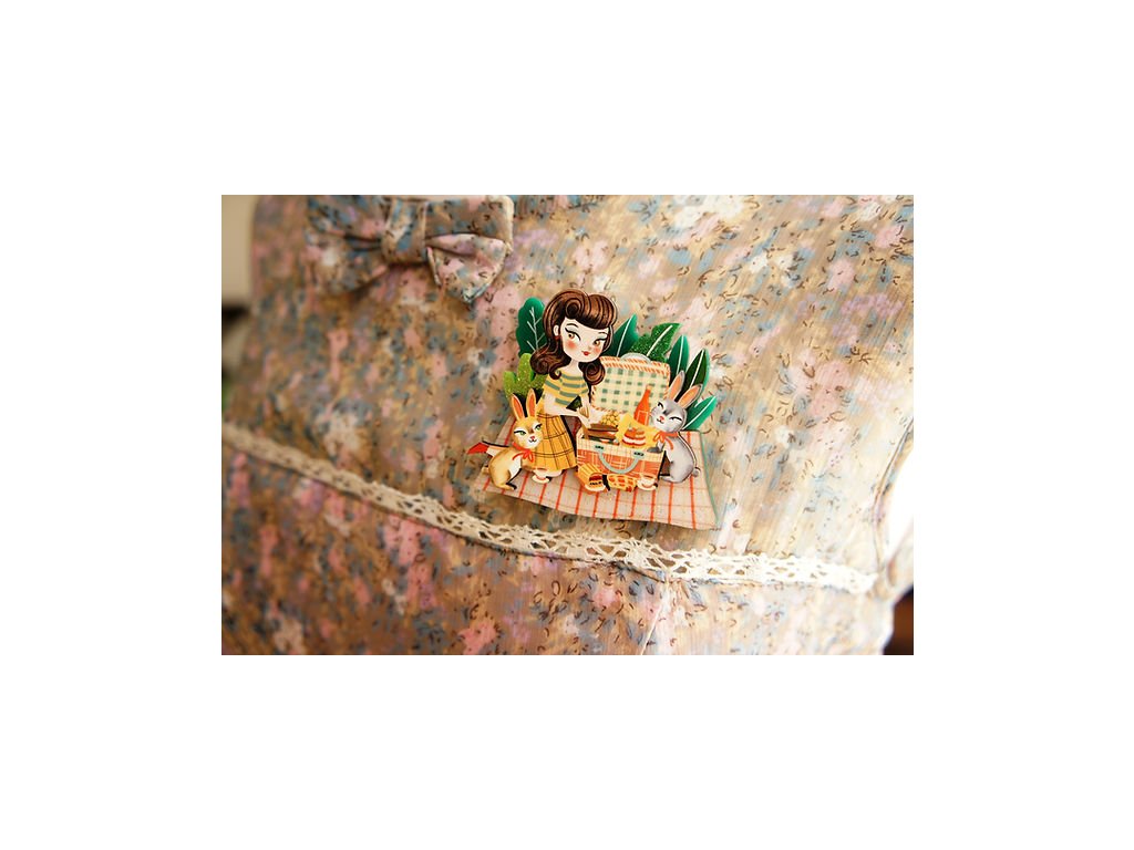 Přeneste se na sluncem zalitou piknikovou louku s touto kouzelnou broží! Hravý design plný barev, roztomilých zajíčků a piknikového košíku dodá každému outfitu rozkošný retro nádech.