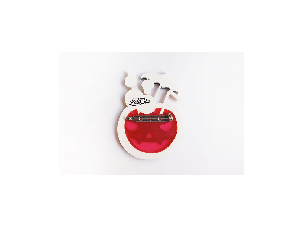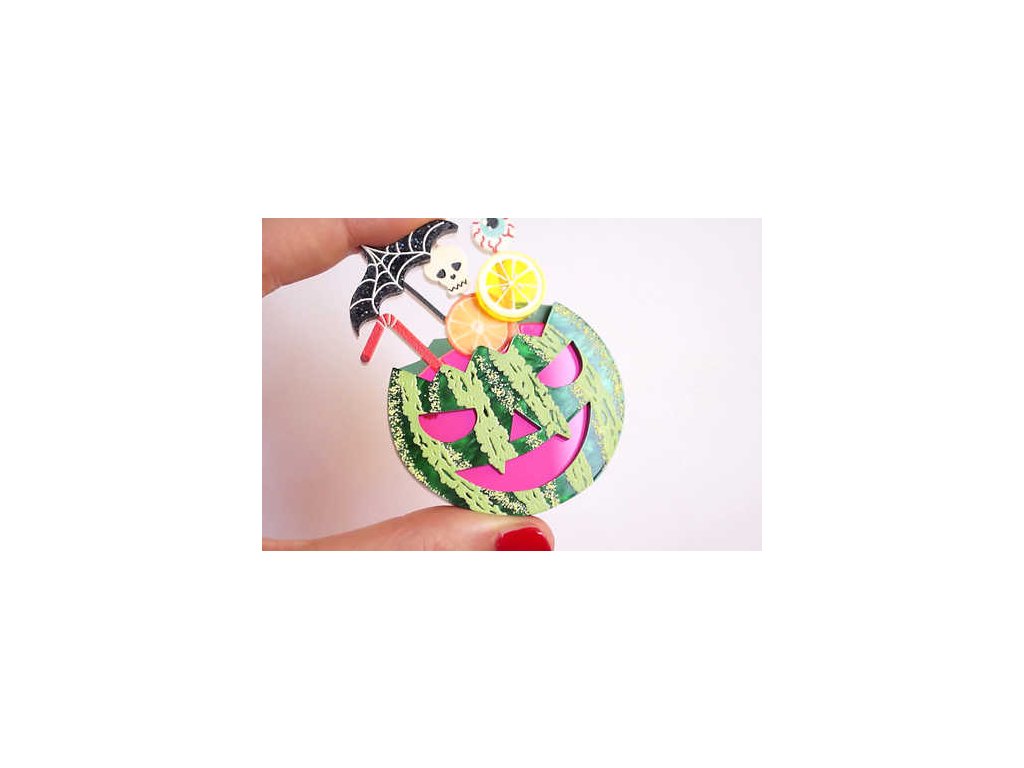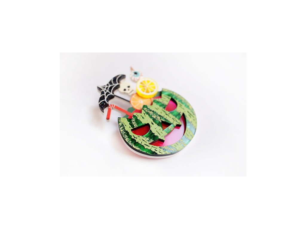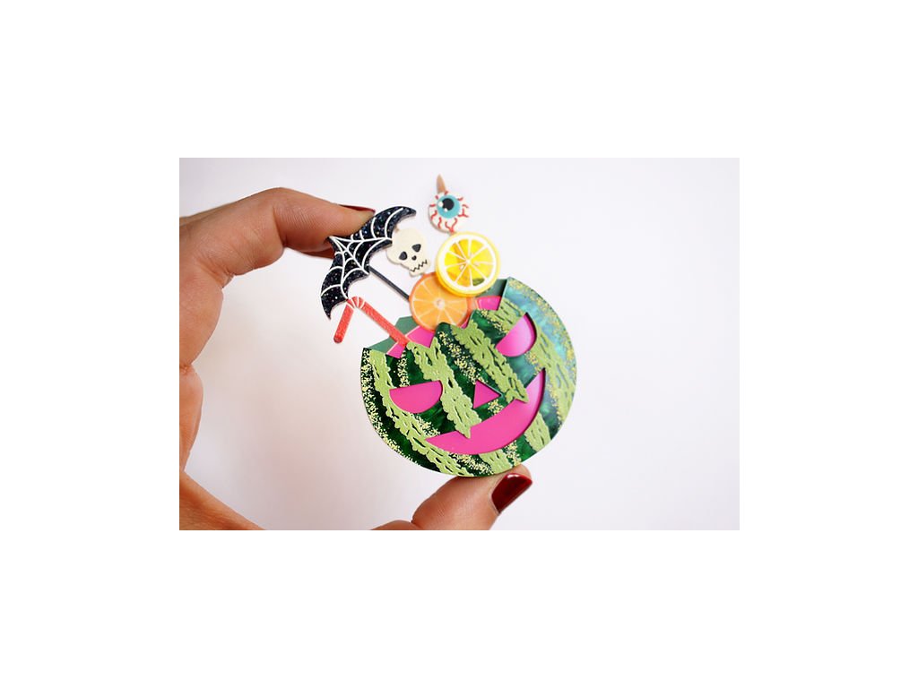 Tato originální brož přináší dokonalou kombinaci léta a Halloweenu. Veselý melounový koktejl v podobě dýňového obličeje, ozdobený citronem, pomerančem, lebkou, očkem na špejli, pavučinkovým deštníčkem i brčkem – jednoduše mix, který na první pohled zaujme každého milovníka neotřelých doplňků.