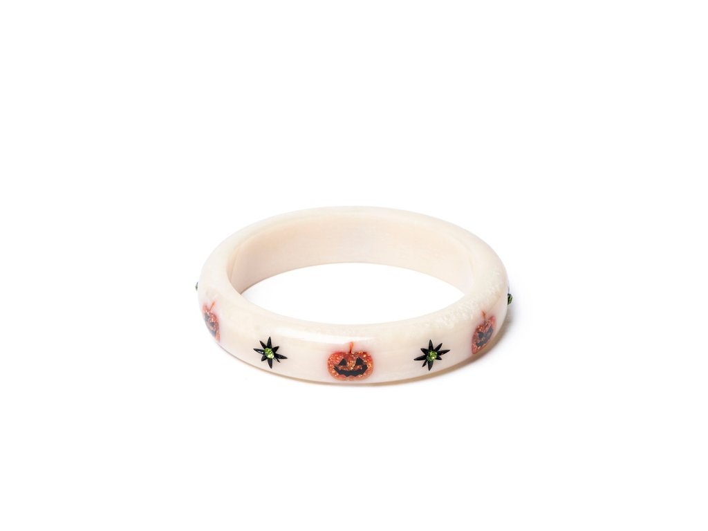 Midi Gourdgeous Bangle od Splendette přináší kouzlo Halloweenu v elegantní a ženské podobě. Jemná krémová pryskyřice je zdobena vyřezávanými dýňovými motivy s třpytivými detaily a malými zelenými kamínky. Náramek působí slavnostně, přitom jemně – perfektní pro podzimní outfity i celoroční vintage look.