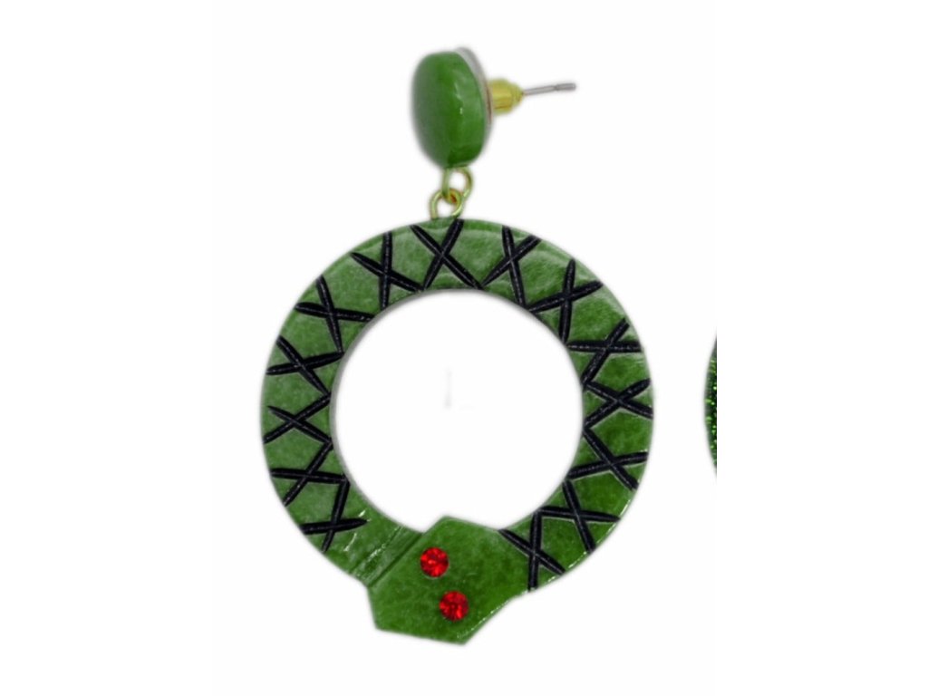 Slither Drop Hoop Earrings od Splendette jsou opravdovým klenotem pro milovnice originálních doplňků. Tyto lesklé zelené hadí náušnice s detailně propracovanými očky z kamínků spojují styl a hravost – ideální volba pro Halloween, tematickou párty i jako výrazný doplněk k retro outfitu.