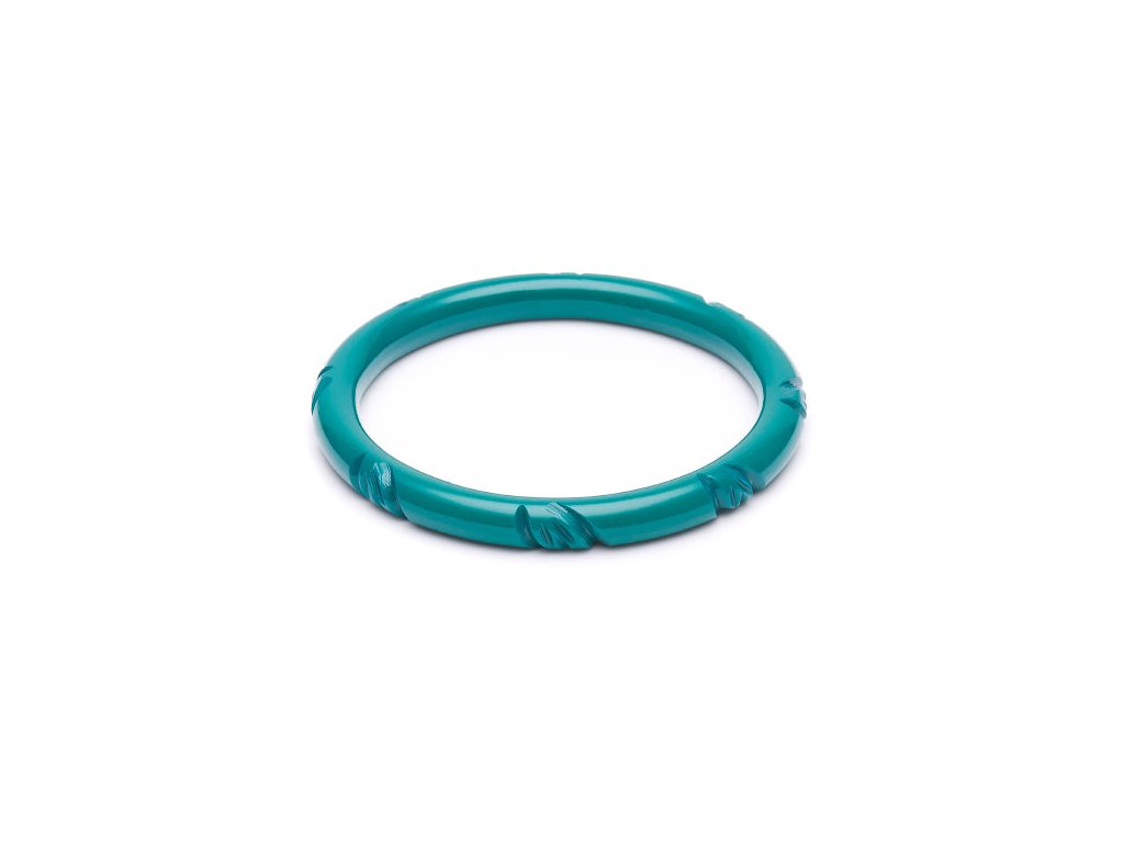 Svěží, výrazný a nepřehlédnutelný. Náramek Narrow Jade Green Heavy Carve od značky Splendette okouzlí svou sytou zelenou barvou a výrazným plastickým zdobením inspirovaným přírodními tvary. Připomíná tropické listy i klidnou hladinu vody a dodává outfitu nádech exotiky a elegance.