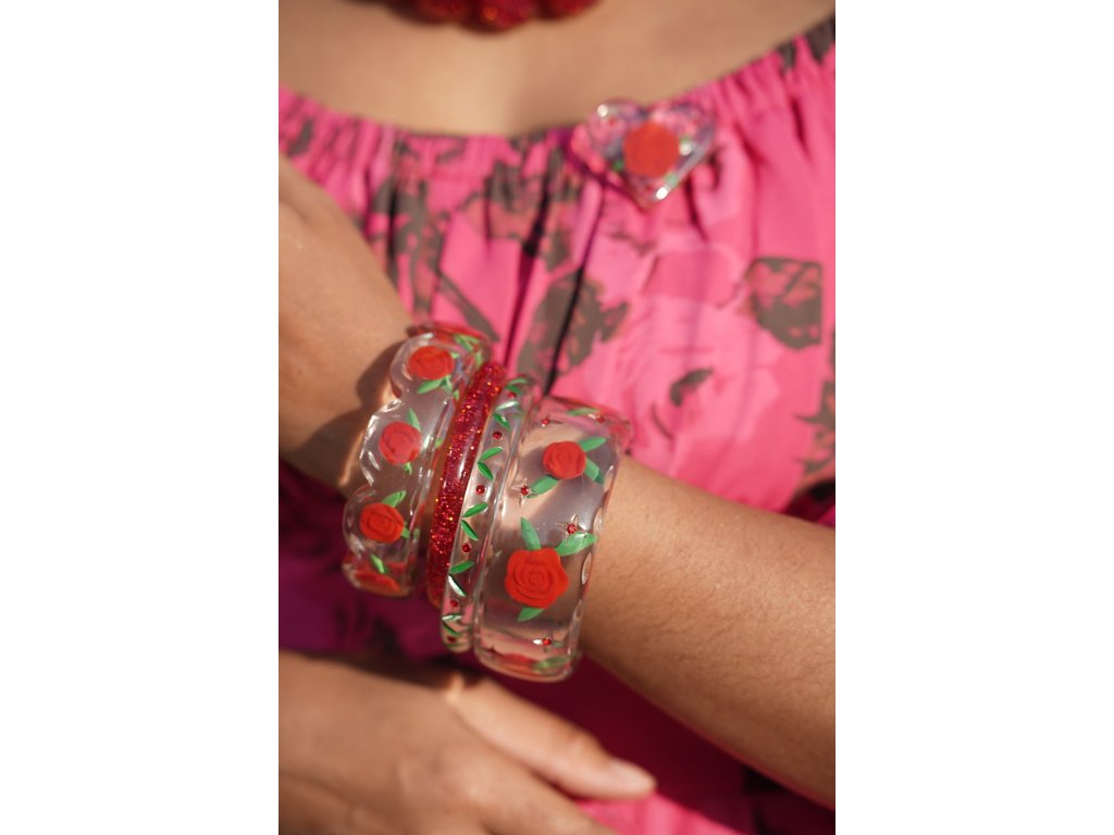Láska ukrytá v detailech. Úzký náramek Lover’s Knot od značky Splendette je vyroben z čiré pryskyřice a zdoben drobnými červenými kamínky a jemným listovým dekorem, které mu dodávají romantický třpyt a nostalgický vintage nádech.